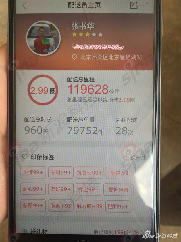 张书华是京东在雁栖湖站点的一名配送员,一般来说,北京市区的一个站点负责的区域大约是方圆十公里左右,张书华一个人负责的区域要接近50公里。在张书华的快递员主页上,截止2016年7月23日,他的配送总时长为960天,配送总里程119628公里,绕地球3圈。